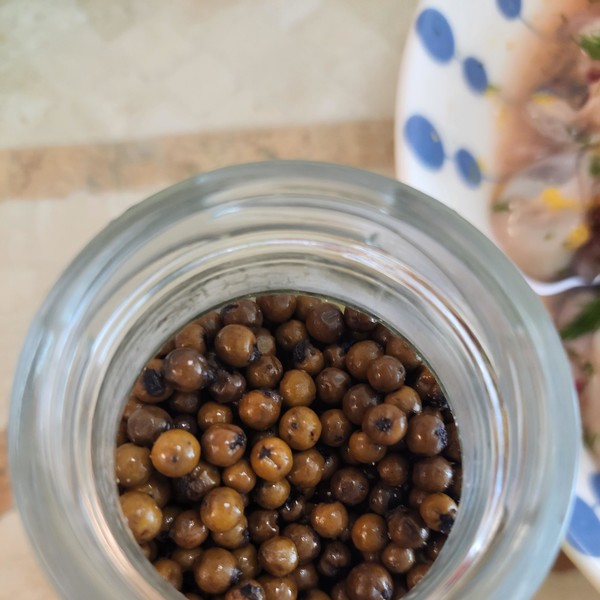 굴세비체에도 너무 잘 어울리네요 씹힐 때마다 톡톡 터지면서 향긋하고 우아하면서 다채로운 맛의 향연이 느껴지는 게 음식의 격을 한 단계 올려주는 flavor bomb 같은 느낌이에요 근데 개봉 전에 실온보관해도 된다 해서 어두운 찬장에 보관했더니 날이 풀려서 그런지 물기가 척척하게 나온 게 보이더라구요 그래서 냉장고로 옮겼어요 겨울 빼곤 오자마자 냉장보관하는 게 나을 거 같아요